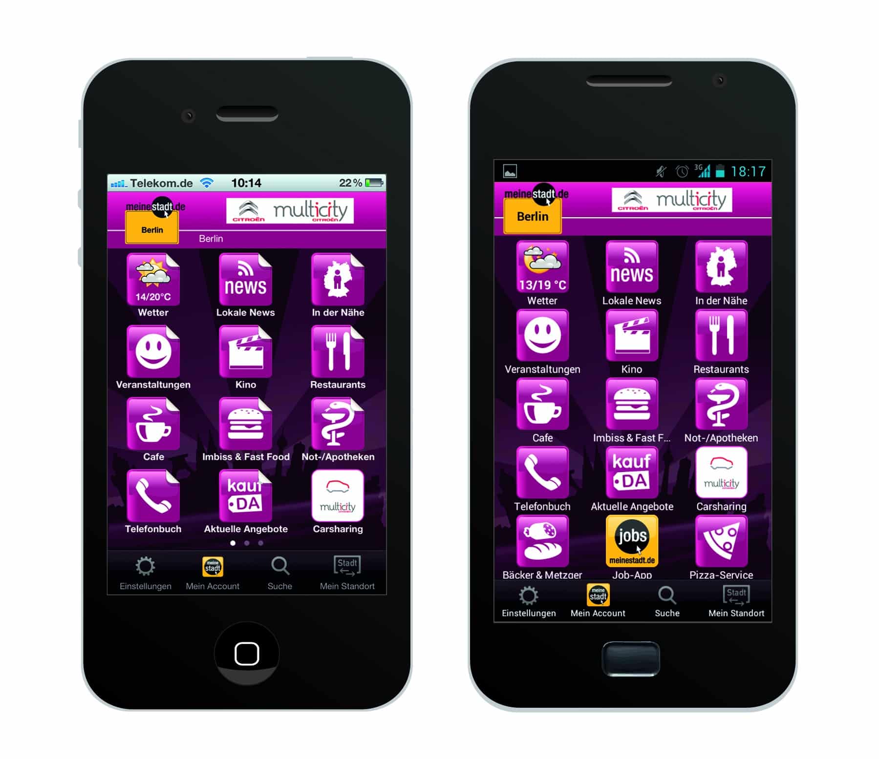 ein Komplett-Branding der meinestadt.de-App im Corporate Design des